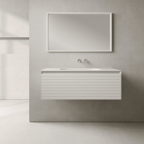 Its floating design enhances a sense of space, while the single soft-close drawer provides discreet yet generous storage. Each piece is completed with a solid Hansel Stone recessed sink, engineered for exceptional durability and a flawless surface that’s as practical as it is beautiful.