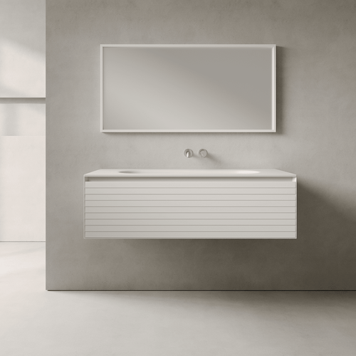 Its floating design enhances a sense of space, while the single soft-close drawer provides discreet yet generous storage. Each piece is completed with a solid Hansel Stone recessed sink, engineered for exceptional durability and a flawless surface that’s as practical as it is beautiful.