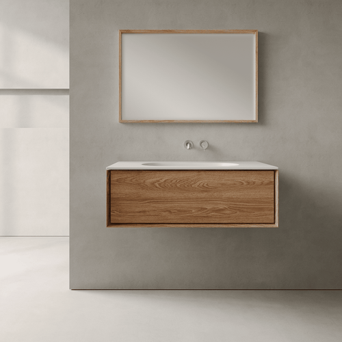 Paired with a solid Hansel Stone recessed sink, the Valmere offers a seamless fusion of strength and elegance — a durable, non-porous surface that perfectly complements the tactile warmth of wood. Designed to float effortlessly on the wall, Valmere creates a sense of lightness and space while providing generous, thoughtfully organised storage.